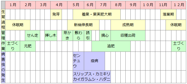 好適土壌酸度は中性から弱アルカリで、石灰の吸収量も多いことから、土壌改良のため石灰質資材の施用は重要です。苦土石灰100kg/10aを基準に土壌酸度も考慮して施用します。完熟堆肥を2t/10a程度施し、土づくりに努める。施肥は表を基準に土壌条件や樹勢により加減します。元肥は肥効を長く維持させるために、有機質主体の肥料を施用します。追肥も肥効を持続させるため、緩効性肥料を利用すると、施肥の回数が少なくできます。