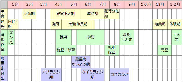 安定生産には貯蔵養分を多くすることが重要であり、そのために礼肥を重視した施肥を行います。土壌改良には、計画的な深耕と堆肥の施用が望ましいです。好適な土壌pHは6.5程度の弱酸性であり、酸性に傾いていれば冬に苦土石灰を10a当たり100k甘施用します。草との養水分の競合を避けるため、果実肥大期や夏の乾焼期には除草を行います。