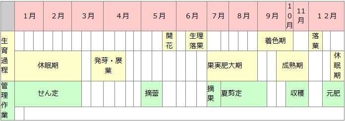 病気については予防散布、害虫については飛来時の早期発見早期防除が基本です。下記の6月と8月の防除を基幹防除として必ず行い、あとはこまめに園を巡回して病害虫の発見に努め、発生を見たときにはただちに防除を行うようにします。薬剤は、必ず登録のあるものを使用し、濃度や回数など、ラベルに記載されている事項を必ず守ってください。