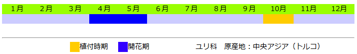よい球根を買っても、植えるまで湿った所や直射日光の当たるところに置いておくと、球根にカビが生えたり、腐ったりしてしまいます。10月が植え付けの適期です。植えるのがあまりに遅くなると、根が伸びないうちに寒い冬が来てしまい、生育不良になってしまいます