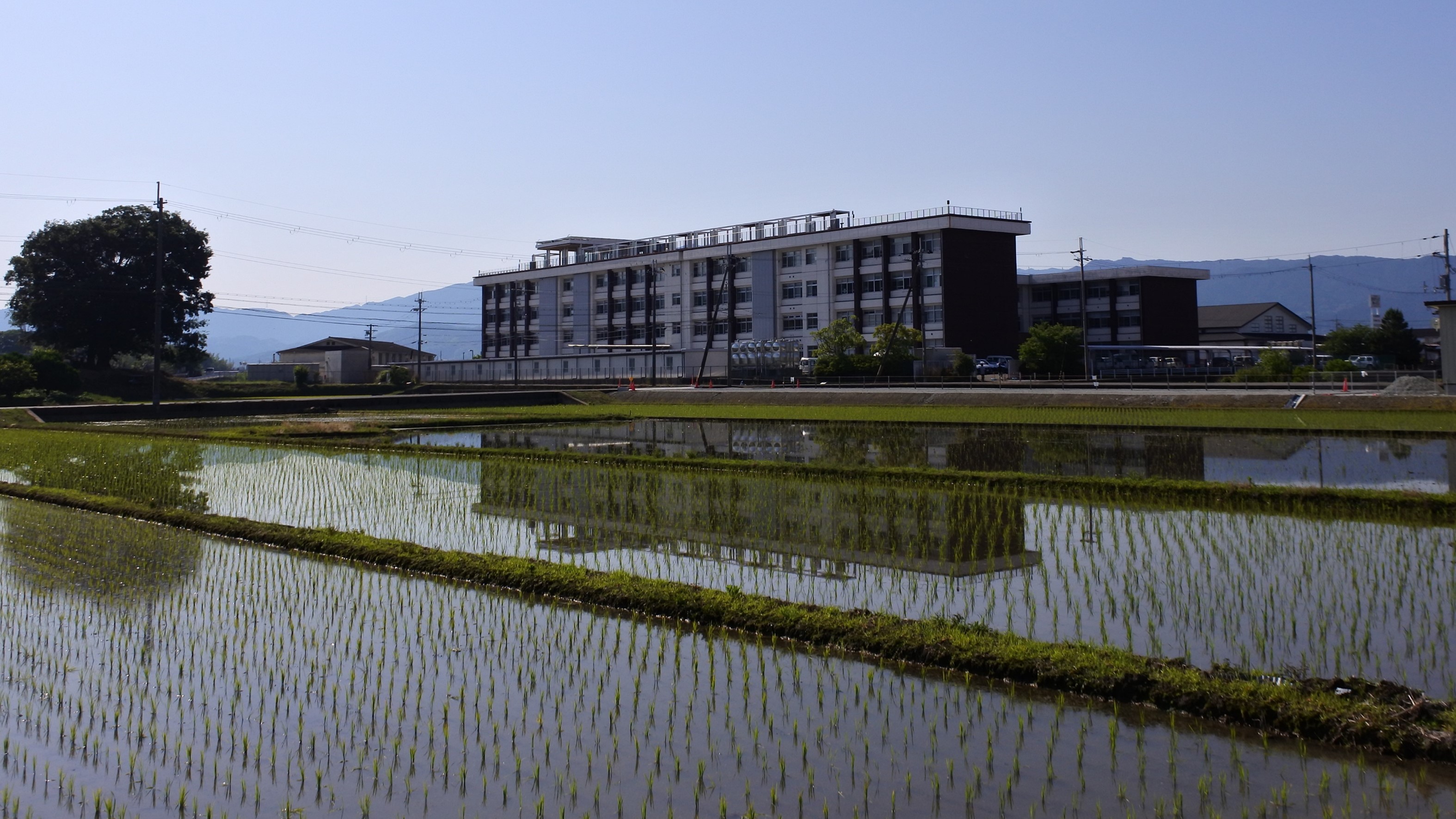 (水田に映る橿原総合庁舎)