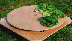回転作業台は厚さ12mm直径90cmの合板製の円形の回転部分と台座部分からなり、中心軸は直径12mmのボルト、回転部はキャスター3個で支持します。包装機械は市販の簡易包装機を使用しました。