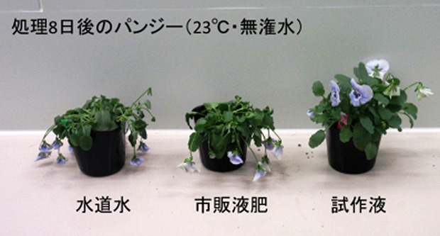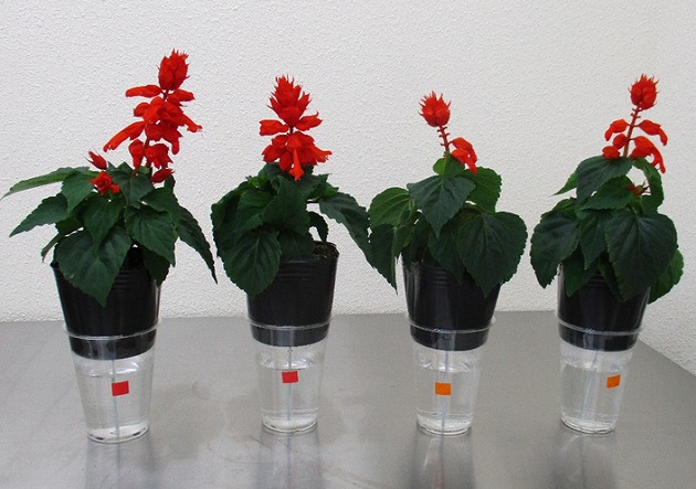 花壇苗では、流通・販売の過程で弱光や乾燥等の不良環境下に置かれることがあり、徒長や黄変、萎凋によって商品価値が低下します。そこで、品質(草姿・葉色)を保ちつつ、無潅水でも萎れにくい出荷前処理液を開発しました。