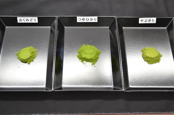 近年、お茶の需要は従来の飲用からお菓子など食用へシフトしています。そこで、秋茶を原料に、当センターで開発したドラムドライヤーを使った処理工程が少ない粉末茶生産方法を用い、色相の良い品種の選抜や製造方法の研究をしました。