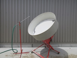 湛水直播では、事前に種子コーティングを行います。その種類には、酸素を発生し、土中での発芽を安定させる効果のあるカルパーコーティング、鉄粉で種子を浮きにくくし、スズメに食べられるのを防ぐ鉄コーティングなどがあります。コーティングの際に必要なのがコーティングマシンです(写真)。回転するドラムの中に種籾を入れ、そこに粉末状のコーティング資材と水を供給しながらコーティングをします。この他、小型のコンクリートミキサーで代用する方もいます。