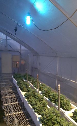 UV-Bの利用には専用の蛍光灯に加えて耐候性の電線やタイマーなどが必要であるため家庭菜園には不向きです。皆さんが利用できる植物の抵抗性反応を利用した技術として、微生物農薬があります。元々自然界に存在するカビを主成分としているため、環境に優しいとされています。この農薬の一つに、たくさんの種類の昆虫に寄生するボーベリア菌という微生物(カビ)を利用したものがあります。このボーベリア菌を散布すると植物表面に定着し、抵抗性を誘導することでうどんこ病の発生を抑えます。このように、紫外線以外にも化学農薬を使わない病気の対策がありますので、興味があれば試してみて下さい。なお、微生物農薬を使うときは、あらかじめ登録をされている作物や使用方法をよくご確認の上、ご使用下さい。(写真:UV-Bランプを用いたキク白さび病の試験の様子)