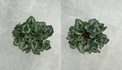 (写真:葉組み作業前後のシクラメンの様子。(左)葉組み前(右)葉組み後)