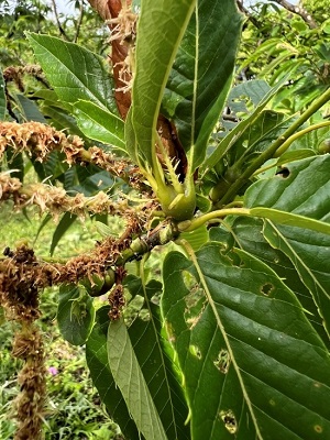 奈良県内東部のクリ園では、「ぽろたん」という品種が栽培されています。渋皮が手でむけて調理しやすく、甘みもある人気の品種ですが、クリタマバチに対する抵抗性はありません。そこで、チュウゴクオナガコバチなど天敵寄生バチの活動が重要な役割を果たします。夏から秋にかけてクリタマバチに寄生したこれらの寄生バチは、クリタマバチを食べて生長し、冬の間、こぶの中で蛹や成虫の状態で過ごし、春に羽化します。冬の剪定時にこぶのついた枝をすぐに処分せず、園内に春先まで残しておくことで、寄生バチの羽化と拡散を助けることができます。クリタマバチは、6月~7月頃にかけてこぶから成虫が出てくるため、剪定した枝は寄生バチの羽化後に処分します。こうした環境を整えることで寄生バチの数が安定し、殺虫剤に頼らずクリタマバチの被害を抑えることができます。