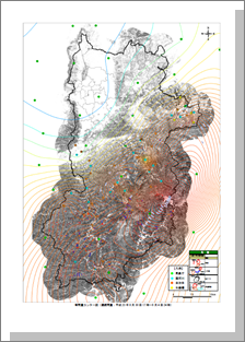 奈良県が、『雨量観測所一覧、雨量データ一覧』(No.1-03)を用いて、等雨量線(等しい雨量の地点を結んだ線)を作成し、図化した資料です。 |