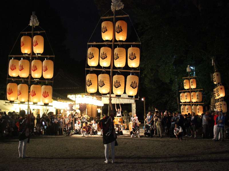 御所地域の氏神として崇敬されている鴨都波(かもつば)神社で行われています。五穀豊穣・家内安全・無病息災を祈願し、氏子地域から「ススキ提灯」と呼ばれる提灯が奉納されます。