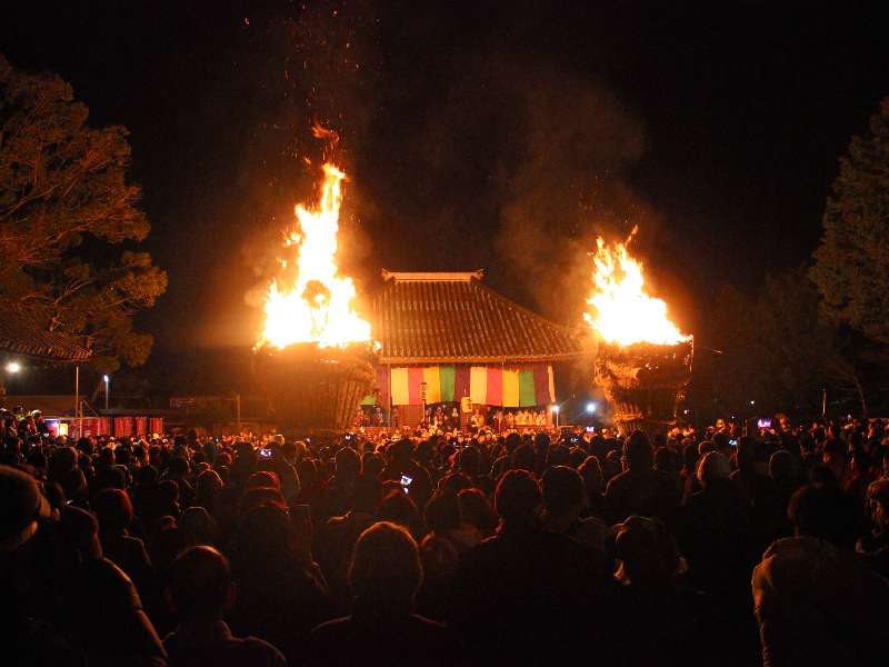 毎年1月14日に行われる、御所市の吉祥草寺に伝わる“大とんど”は、奈良では一番大きいものです。雄雌一対の大松明は、高さ6m、直径3m、重さは700kgで、1300年の歴史を持つと言われます。