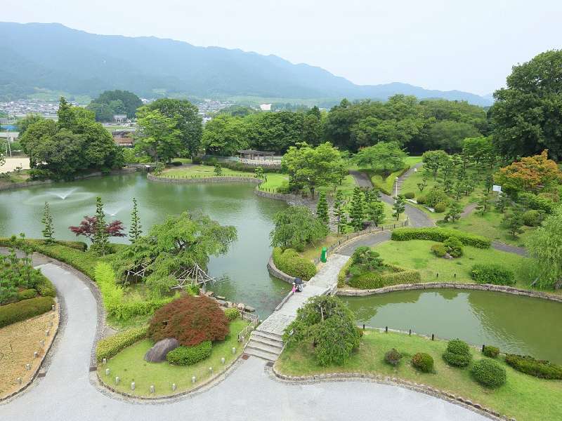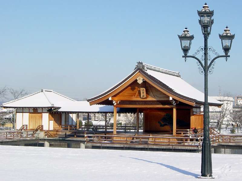 大中池に浮かぶ桜華殿は、市政50周年を記念して寄付により完成しました。この浮舞台では本格的な能が開催されます。