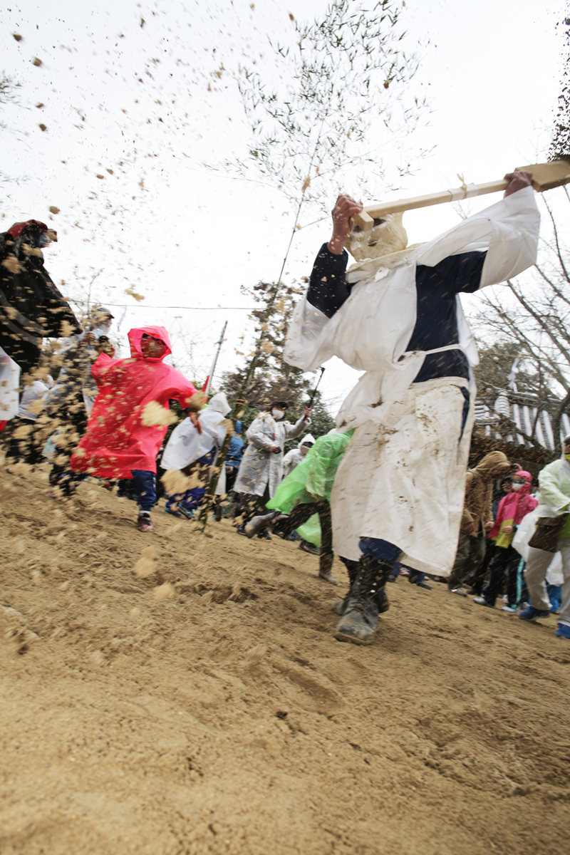 豊穣を祈り行われる祭で、殿上の儀と庭上の儀の二部構成で行われます。庭上の儀では砂を盛んにかけるほどの雨が降るとのいわれから、大人から子供まで参加して激しく砂をかけあいます。