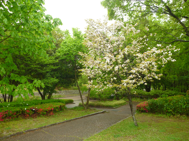 今日の雨で少し散っていますが、公園館前の時計台の近くで、県の花に選定されたナラノヤエザクラが咲いています。
