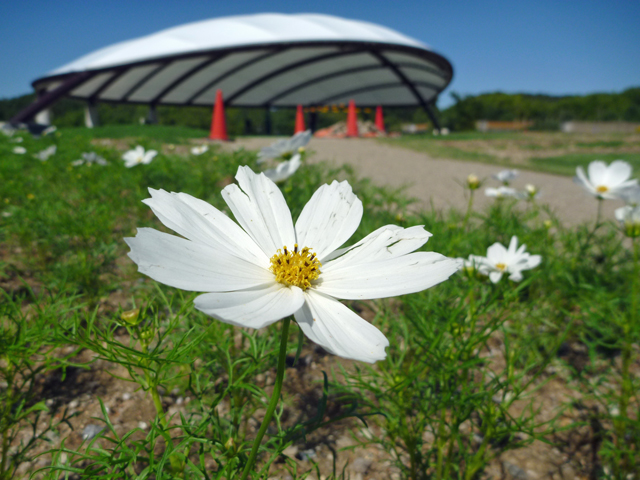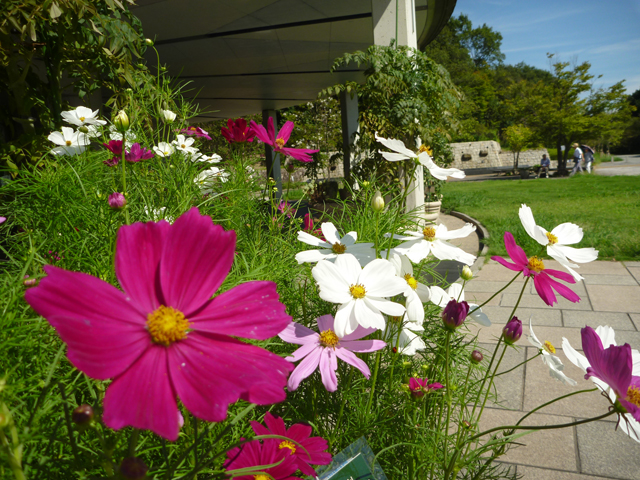 公園館前の鉢植えのコスモスです。花の道の地植えのものや、花見茶屋前の花壇のコスモスは、秋のフェスタに見ごろになる予定です。