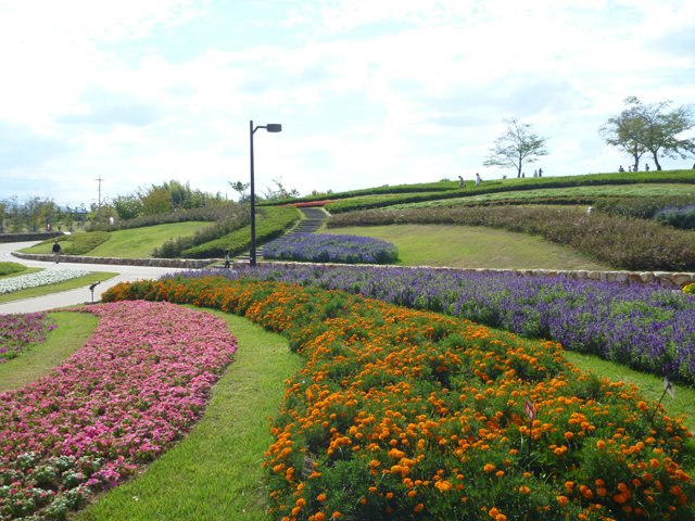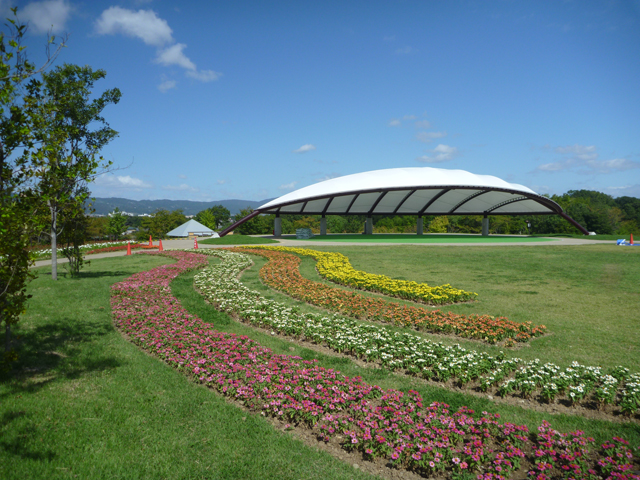 10月5日(土曜日)から開催される馬見フラワーフェスタの、音楽ステージやダリア花じゅうたんの会場になる、北エリア集いの丘で、花壇の植え付けが終了しました。