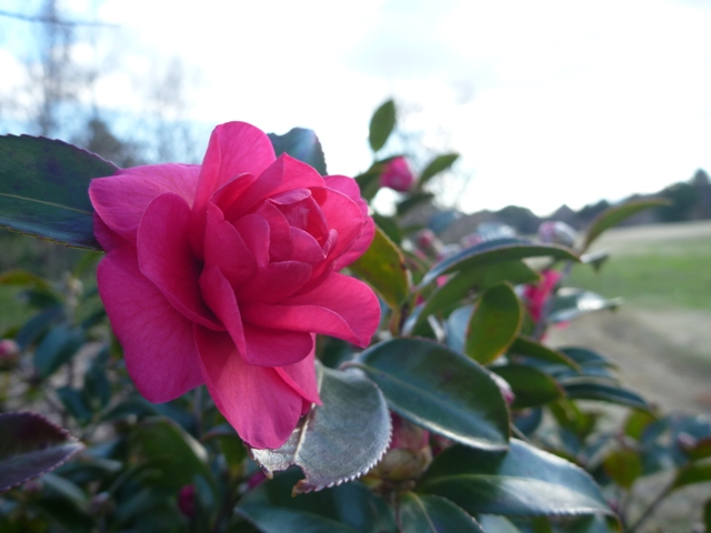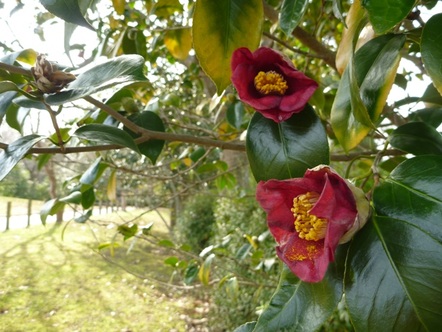 いにしえの丘では、ロウバイの他にもカンツバキが咲いています。