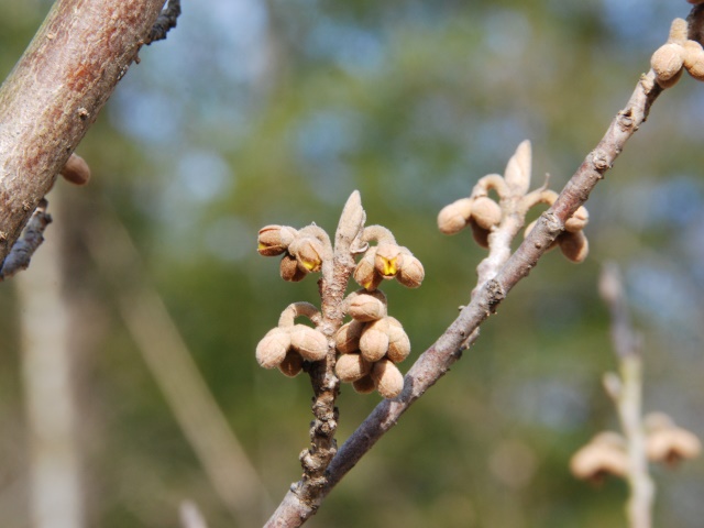 マンサクの花芽は、黄色い花弁が少しのぞいています。昨年は2月4日に開花しています。