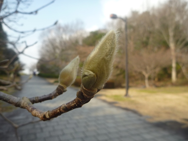 冬の公園では、モクレンの仲間の花芽は大きいので目立っています。写真はハクモクレンの花芽です。