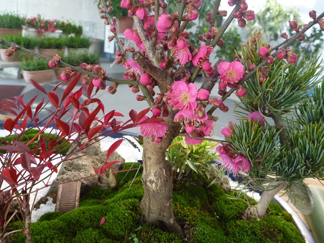 1月9日号で紹介した、公園館玄関ホールに展示中の正月の寄せ植えに使用したウメが、咲き始めました。園内のウメはまだ蕾です。