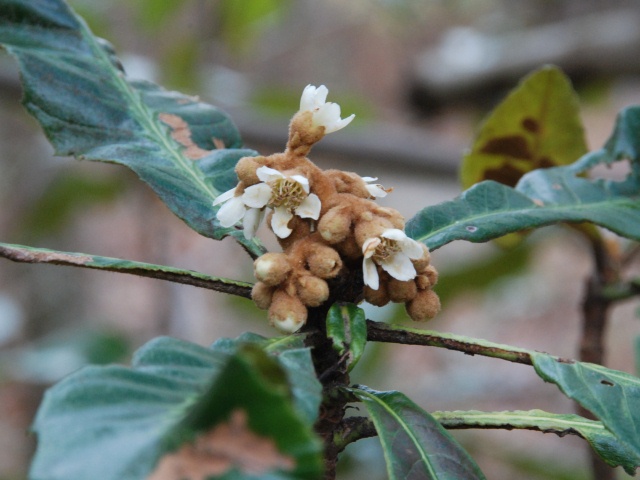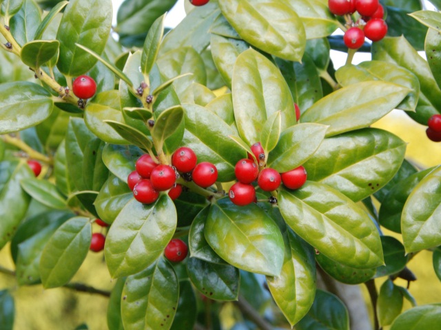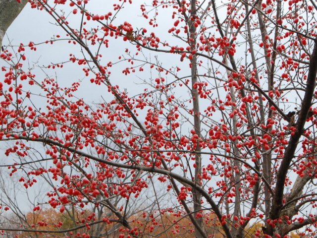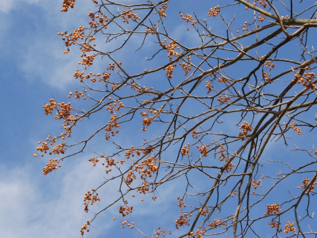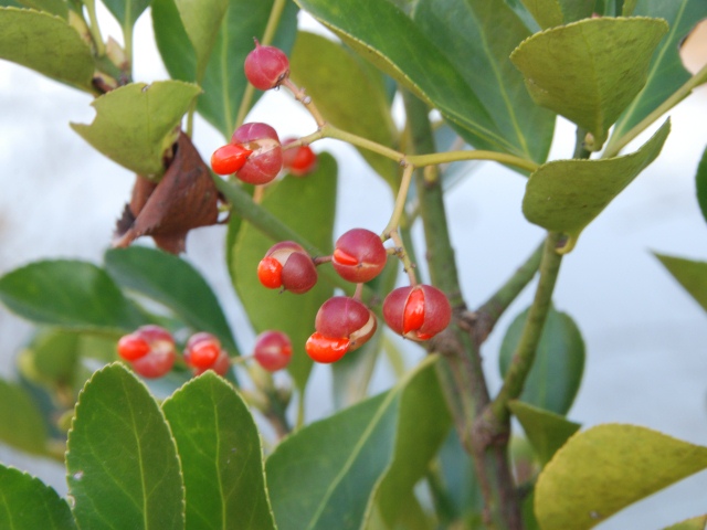 マサキの実が裂けて、朱色の種子がのぞいています。以前は生垣によく使われていましたが、最近はあまり植えられていないようです。
