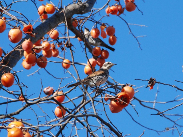 今日の午後は、久しぶりに暖かい日差しを感じました。カキの樹に、いろいろな野鳥が集まっています。写真はツグミですが、メジロやヒヨドリも来ていました。