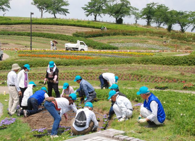 馬見花苑では、夏の花に植え替えが進んでいます。写真は、花サポーターの皆さんが、アゲラタムを植えているところです。
