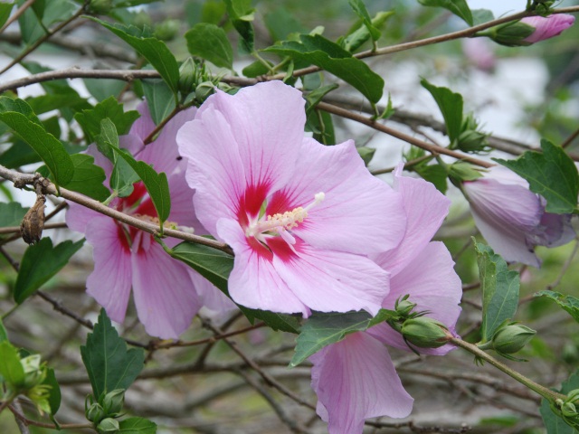 下池近くで、ムクゲが咲き始めました。花がそっくりなように、ハイビスカスの仲間です。