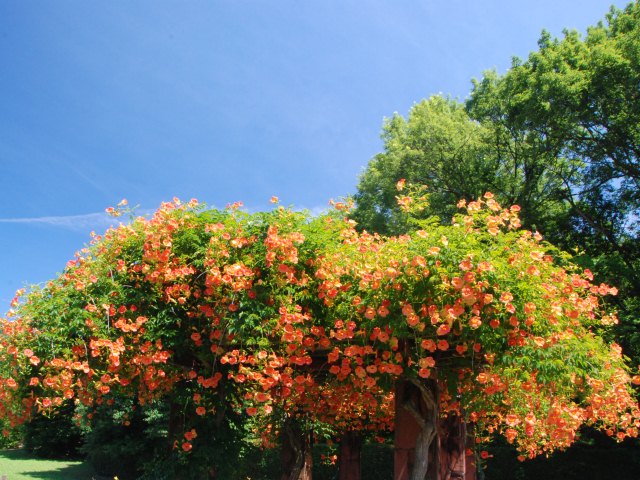 菖蒲園でノウゼンカズラが咲き始めました。中国原産のつる性植物ですが、平安時代から栽培されていたと言われています。