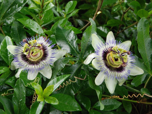 中央エリアのダダオシ橋の下で、トケイソウが咲いています。花を長針、短針、秒針、文字盤に見立てています。