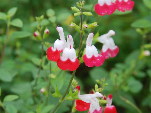サルビア・ミクロフィラ(チェリーセージ)は一般的な赤い花だけでなく、赤と白のかわいいツートンカラーの花も咲かせています。
