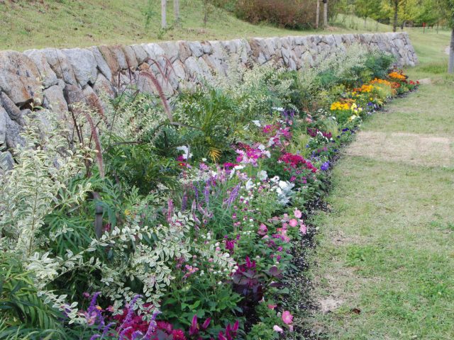 「花の道」では、ニューギニアインパチエンス(桃色や白色の花)、宿根サルビア(紫色の花)やコスモスなどが綺麗に咲いています。