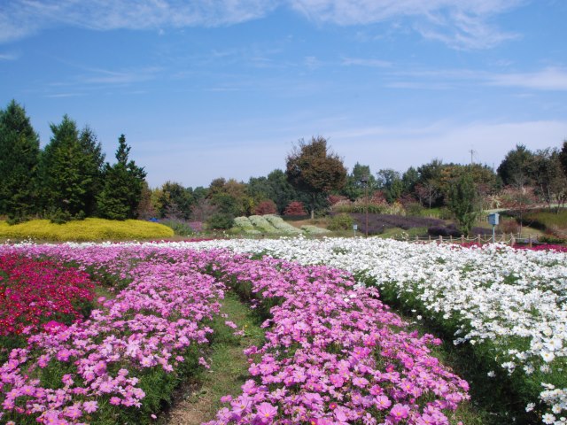 園内ではダリアからコスモスに、メインの花が移ってきました。写真の「花の道」には約3万本あります。