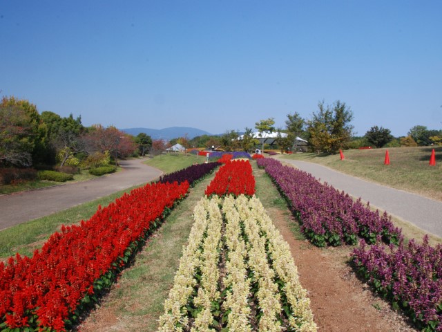 「集いの丘」外周部のサルビアが満開です。手前に見える赤、薄紫、濃紫ともサルビア・スプレンデンスです。