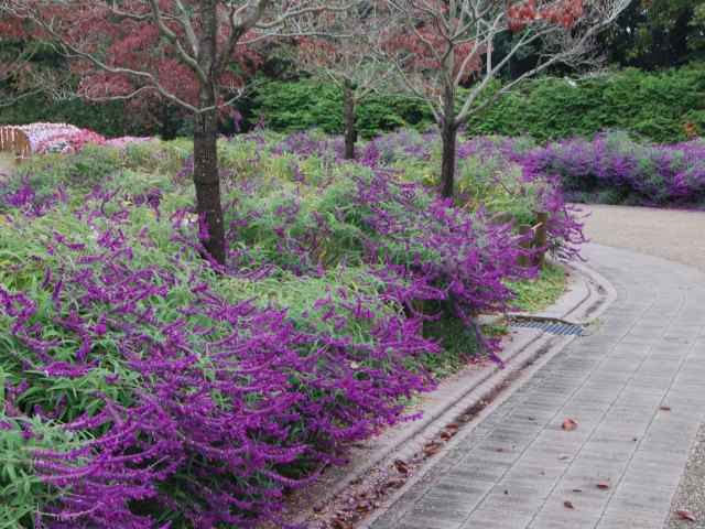 「花の道」で宿根サルビアが花盛りです。写真はサルビア・インボルクラータです。