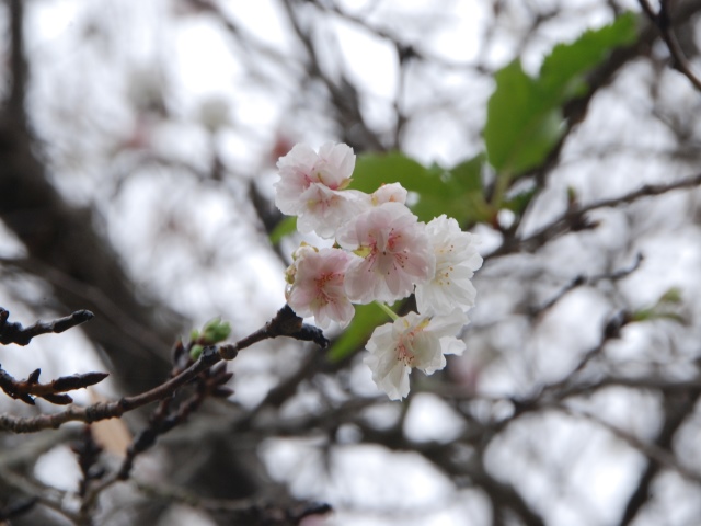 「陽だまり広場」でコブクザクラが咲いています。厳冬期はあまり花が咲きませんが、春まで開花します。