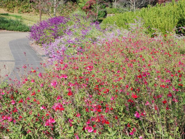 サルビア・ミクロフィラは長い期間咲き続けています。後方はサルビア・レウカンサです。