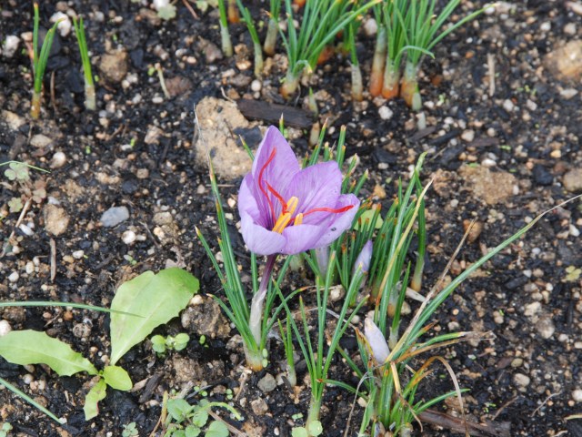 「花の道」でサフランが咲き始めました。近くでは八重咲きのコルチカムも咲いています。
