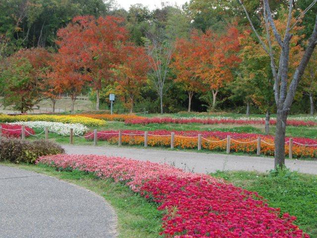 「彩りの広場」周辺では、ジニアが色鮮やかに咲き誇っています。後方の紅葉はサルスベリです。