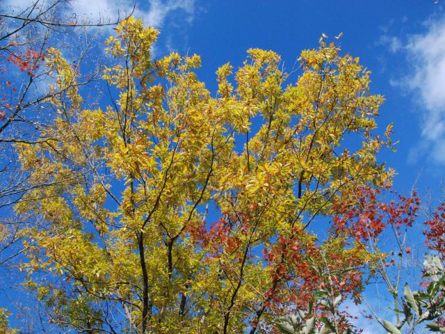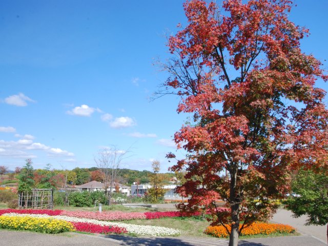 園内の木々はだんだん秋色になってきました。ケヤキは赤や黄色に色づいています。