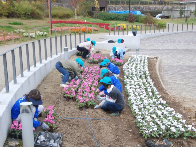 クリスマスに向けてガーデンシクラメンを植えました。作業されているのは、花緑ボランティアの皆さんです。