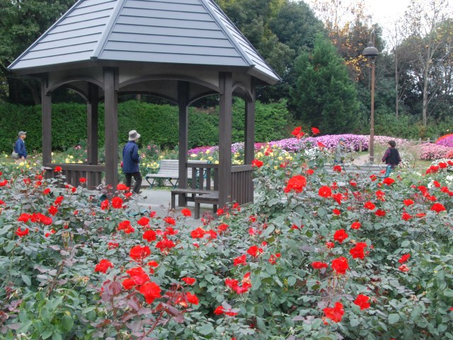 「バラ園」は見頃が続いています。後方のニューギニアインパチエンスも満開です。