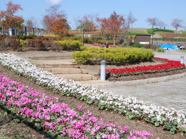「花見茶屋」前花壇は、ガーデンシクラメンに植え替えられました。これから年末にかけて、園内の花壇は主にチューリップが植えられます。