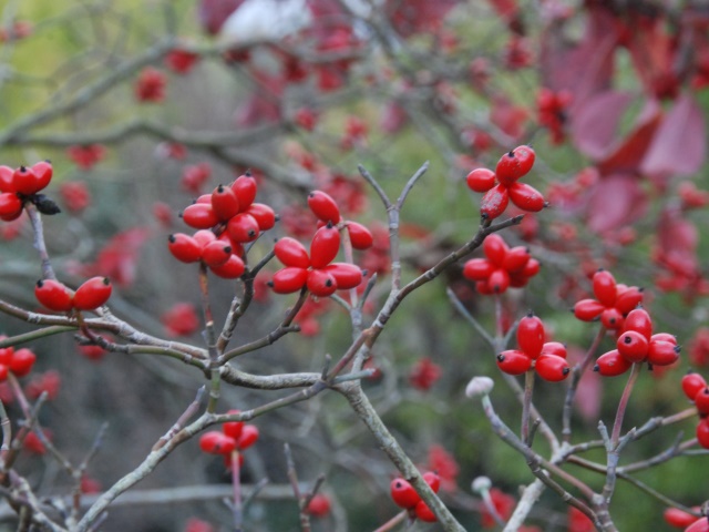 大部分の落葉樹が葉を落として寂しくなってきましたが、その代わりに実が目立つようになりました。写真はハナミズキの実です。