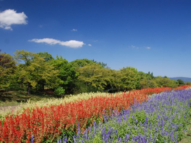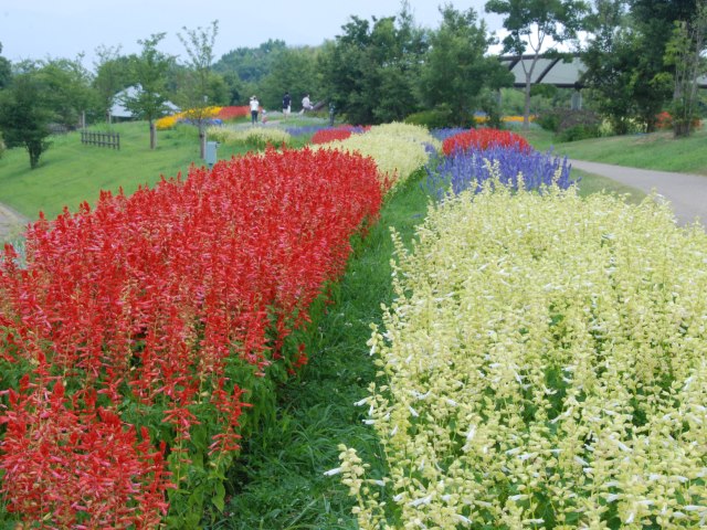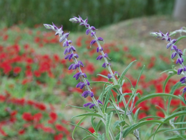 「花の道」にたくさん植えられている、サルビア・レウカンサの花芽が色づいてきました。同じ仲間のサルビア・インディゴスパイアーズなどは、初夏から咲き続けています。