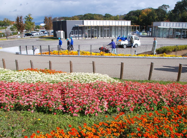 ダリア園近くでは、ジニアが色とりどりの花を咲かせています。後方の花壇では、ボランティアの皆さんがビオラを植え付けています。