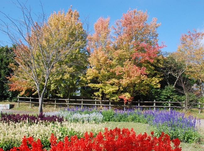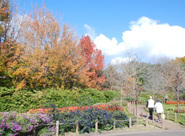 「花の道」の紅葉(トウカエデとモミジバフウ)です。宿根サルビア(手前の紫色)もまだ綺麗です。