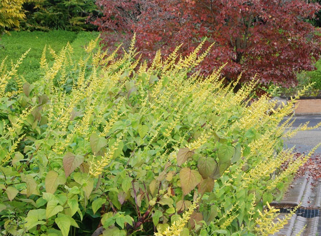 「花の道」では宿根サルビアが花盛りです。写真は見頃になったサルビア・イエローマジェスティです。珍しい黄色のサルビアです。