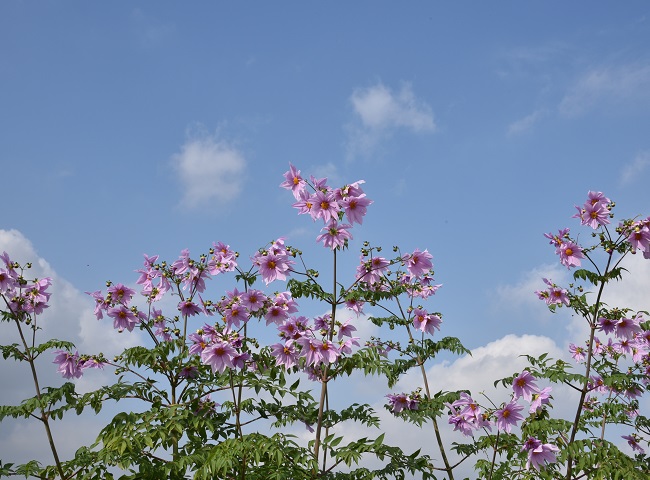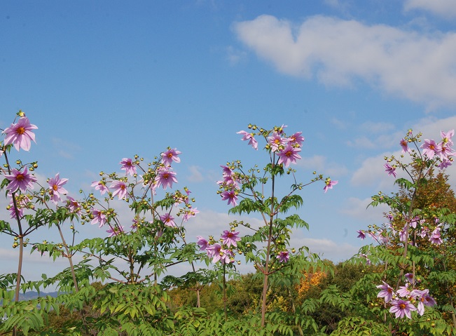 ダリアは写真のように綺麗に咲いている品種(宙:そら)もありますが、そろそろ見納めです。皇帝ダリアは咲き始めたばかりです。