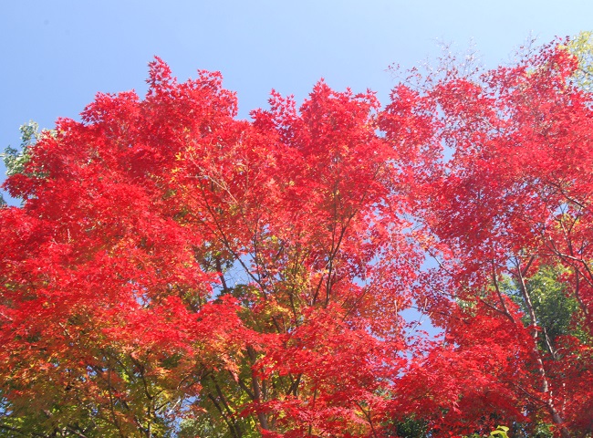 「公園館」近くの壁泉の上にあるイロハモミジです。真っ赤に色づいています。今年は紅葉の当たり年のようです。